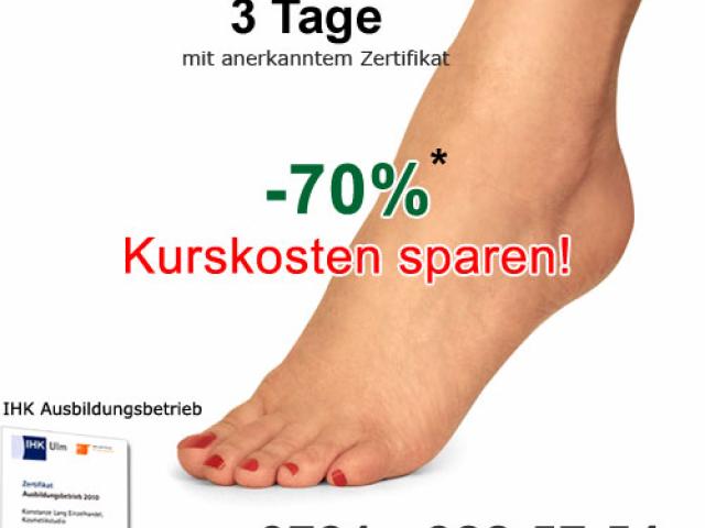 Grundausbildung Fußpflege zertifiziert 4 Tage MerklingenPreis erfragenIhre Grundausbildung in der kosmetischen Fußpflege. Eine Schritt für Schritt Ausbildung zum professionellen Fußpfleger/in mit Zertifikat. Theoretische und Praktische Ausbildung. Ihre Intensivausbildung. Lernen Sie alles über den Aufbau des Fußes, Kno...