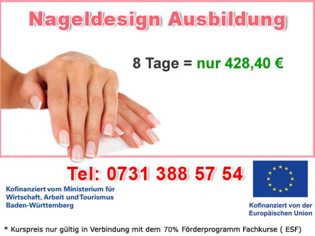 14 Tage Nageldesign Ausbildung nur 756,84 Euro* mit Zertifikat LangenauPreis erfragen14 Tage Nageldesign Ausbildung günstig im Paket mit Zertifikat. 2in1 Ausbildung. Qualitäts-Ausbildung nach deutschen und europäischen Richtlinien. Dieser Kurs beinhaltet die Nageldesign Ausbildung und die kosmetische Fußpflege Ausbildung. Gerne Perso...